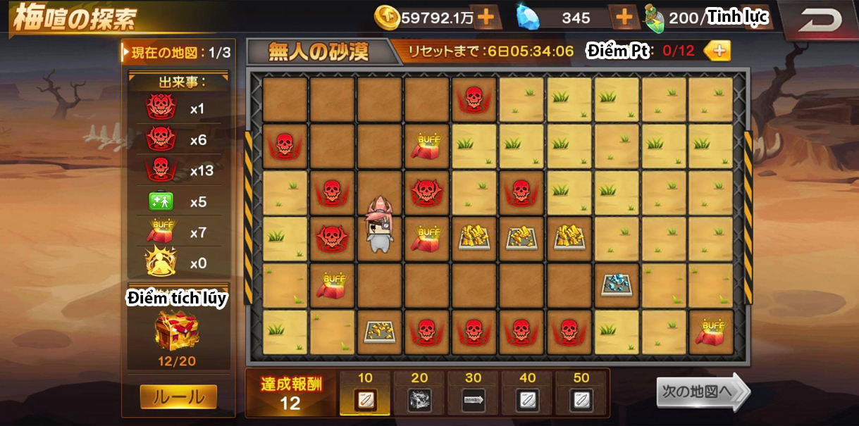 -Mỗi khi hoàn thành 1 sự kiện bên dưới mỗi ô, sẽ tiêu 1 điểm Pt, nếu là sự kiến đánh boss sẽ tiêu thêm tinh lực